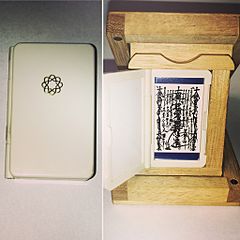 Description: This is a picture of my Omamori Gohonzon as issues by Soka Gakkai International. A dime is placed to the left of the Omamori in order to give a scale for the size of this Gohonzon. . I release all rights to this image. The Japanese calligraphy shown on the Omamori is a transcription of writing by a Japanese Buddhist monk in the 1800s and so is assumed in good faith to be entirely in the public domain.