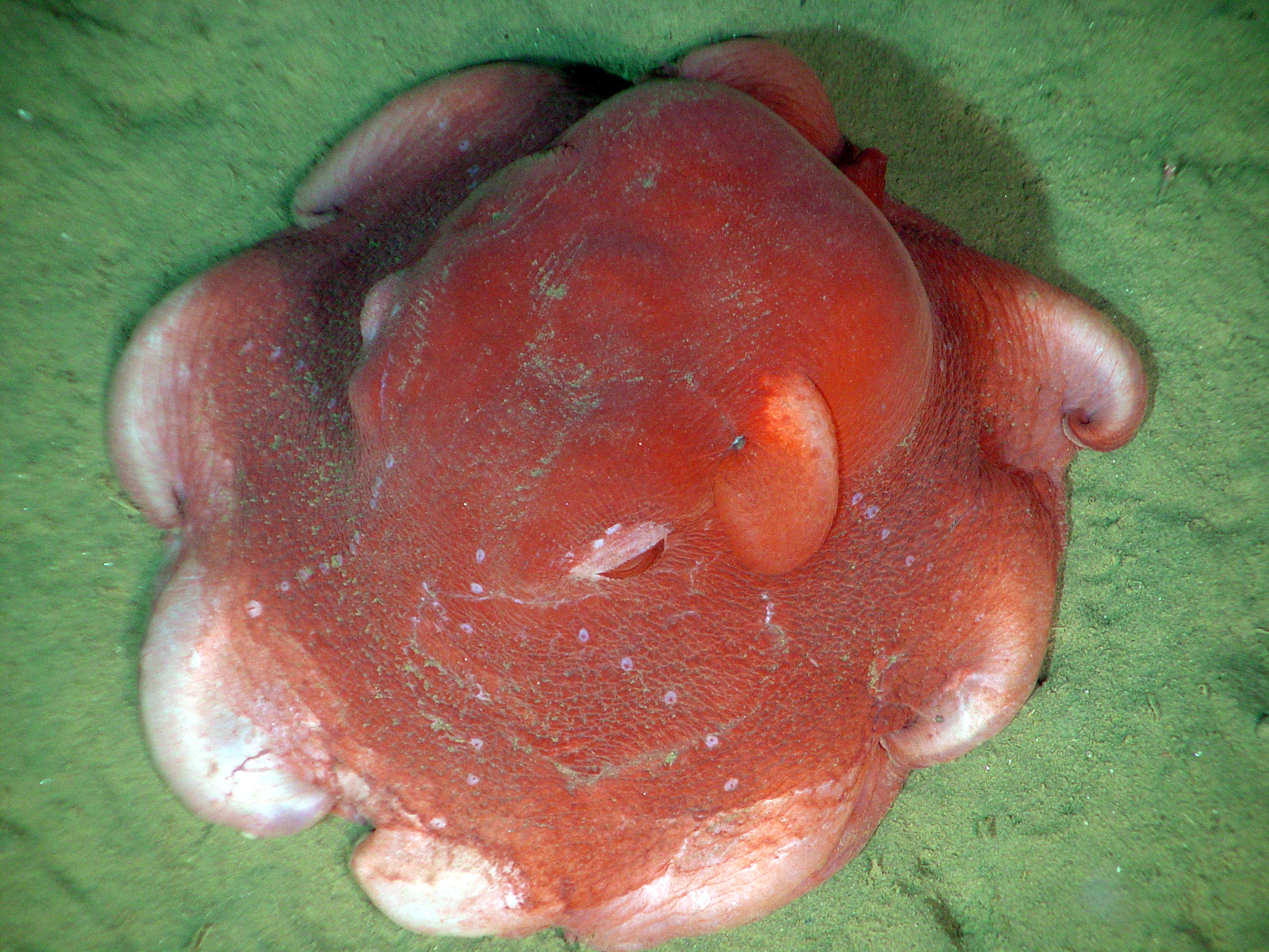 Description: "Dumbo" deep sea cirrate octopus, likely Opisthoteuthis californiana. This type of octopus has muscular lateral fins to propel it.