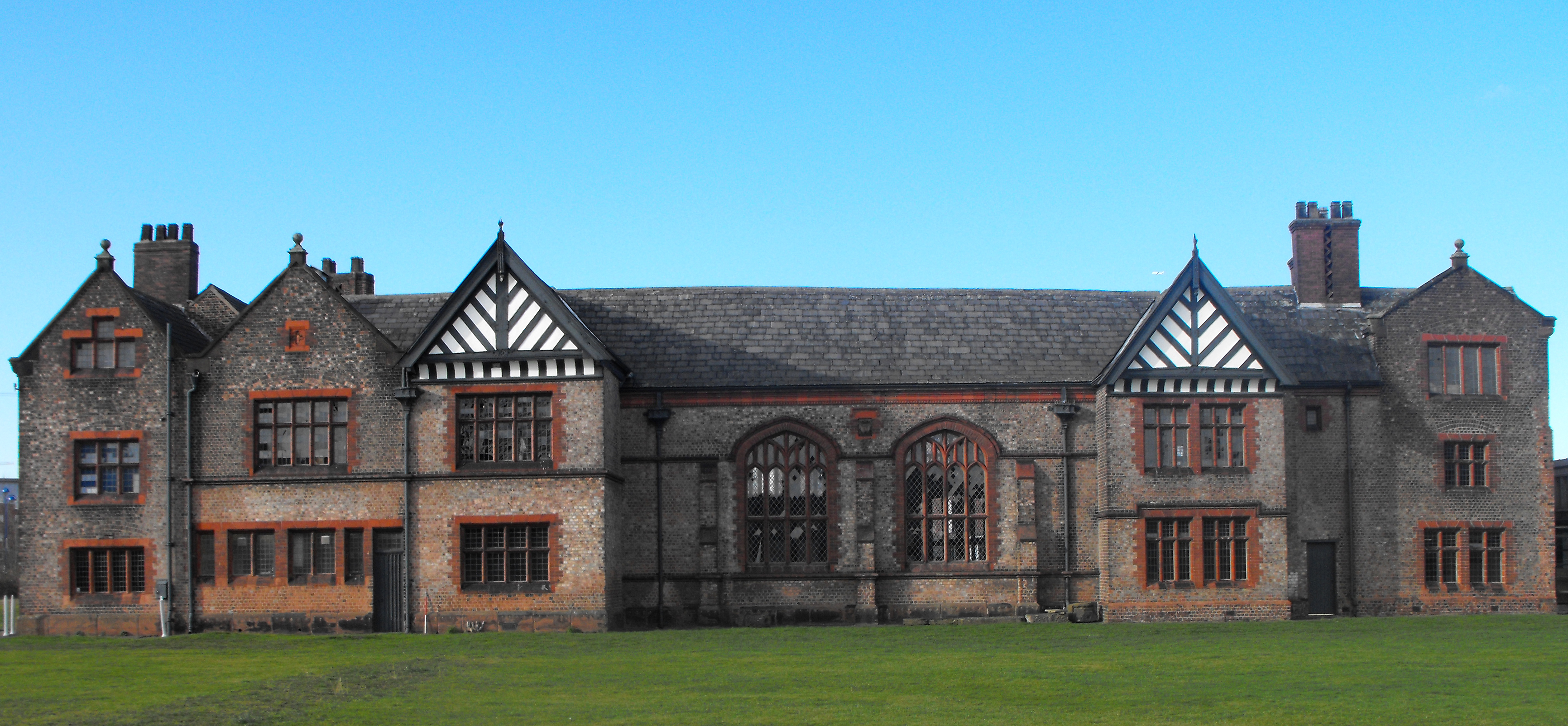 Description: The entire south-east facing side of east wing of Ordsall Hall. The two tallest windows in the centre mark the Great Hall.