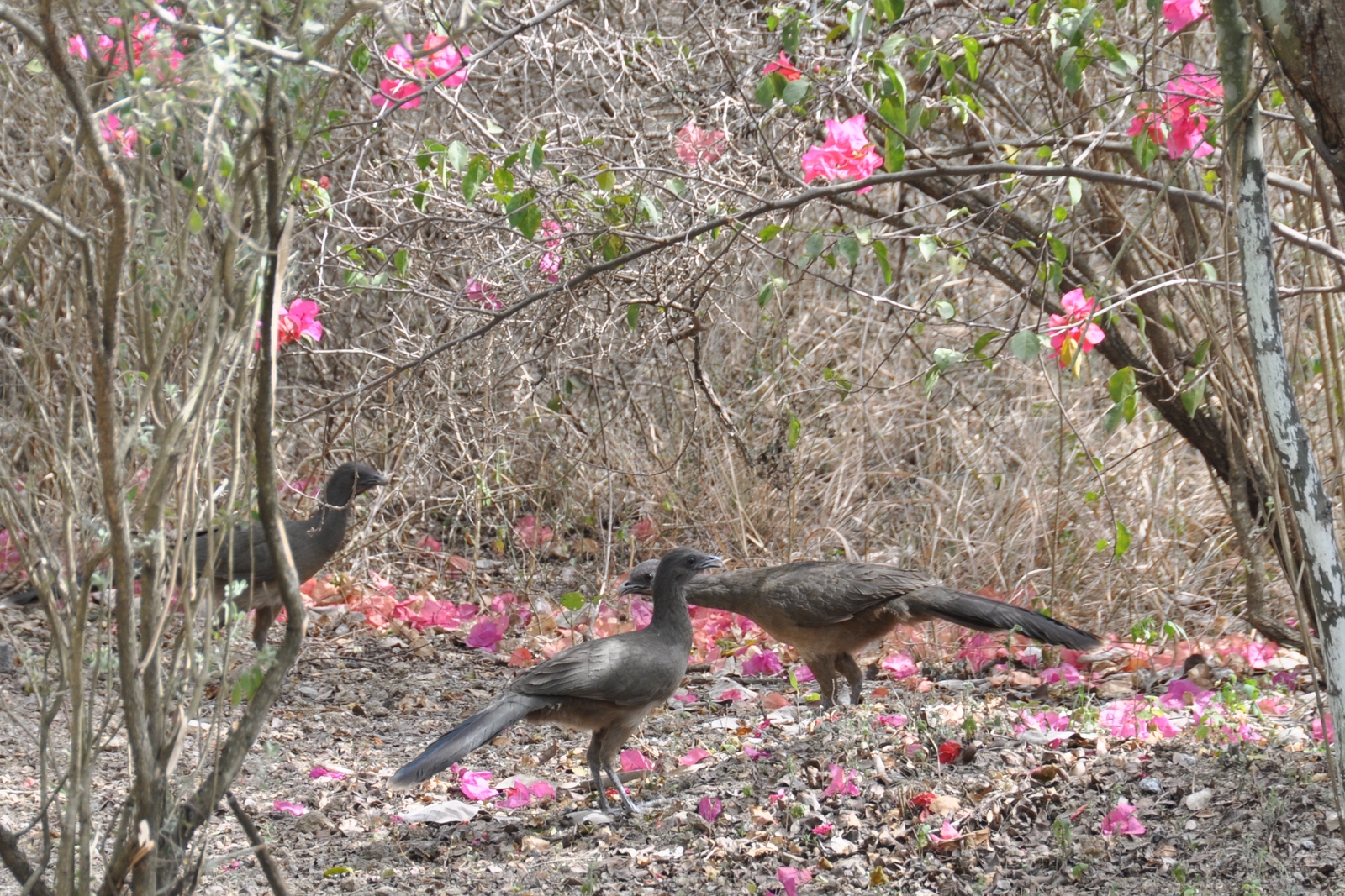 Description: Group of three Plain Chachalacas Ortalis vetula, between Linares and Montemorelos, Huertas, Nuevo León, Mexico.