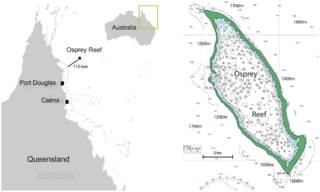 Description: Original caption: "Location map of Osprey Reef, Coral Sea, Australia. Osprey Reef is located 100 km from the outer edge of the northern Great Barrier Reef, rising from around 2000 m depths to just below the surface in an almost vertical reef wall."