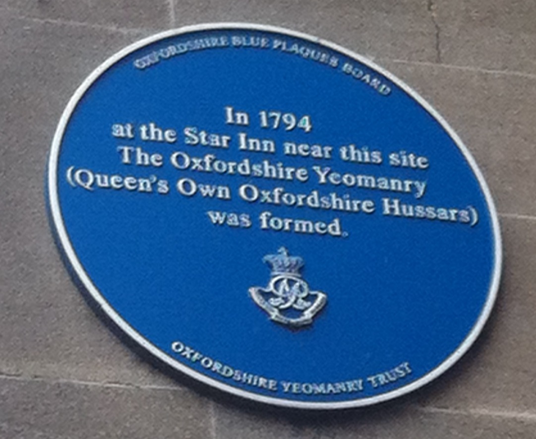 Description: 1Blue plaque on the Clarendon Centre, Cornmarket Street, Oxford, commemorating the foundation in 1794 of the Oxfordshire Yeomanry in the Star Inn that formerly stood on the site.