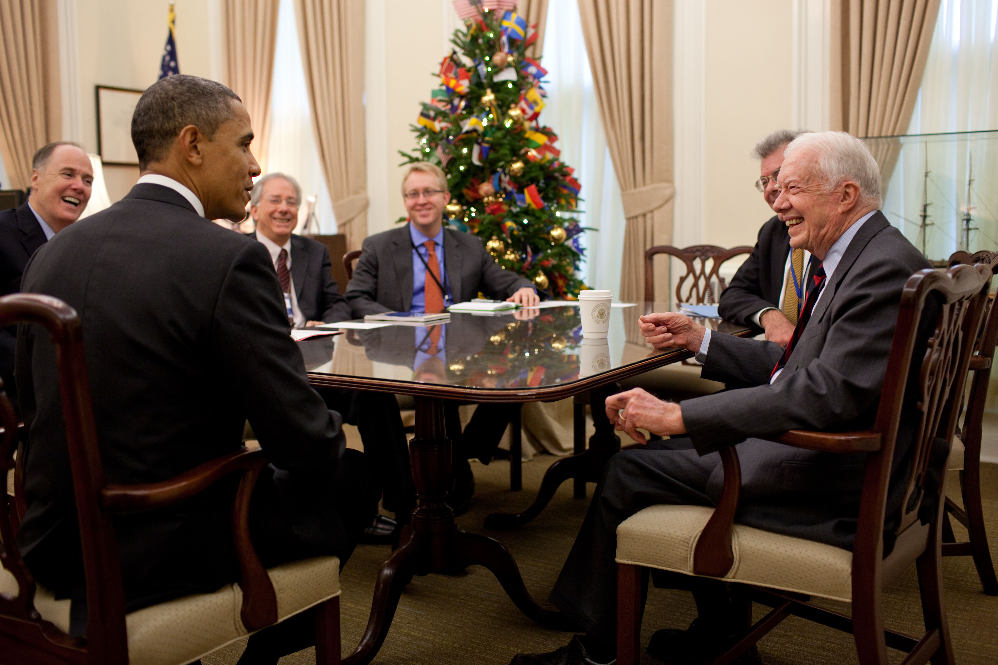 Description: President Barack Obama talks with former President Jimmy Carter who was attending a meeting in National Security Advisor Tom Donilon's office in the White House, Nov. 30, 2010. (Official White House Photo by Pete Souza)