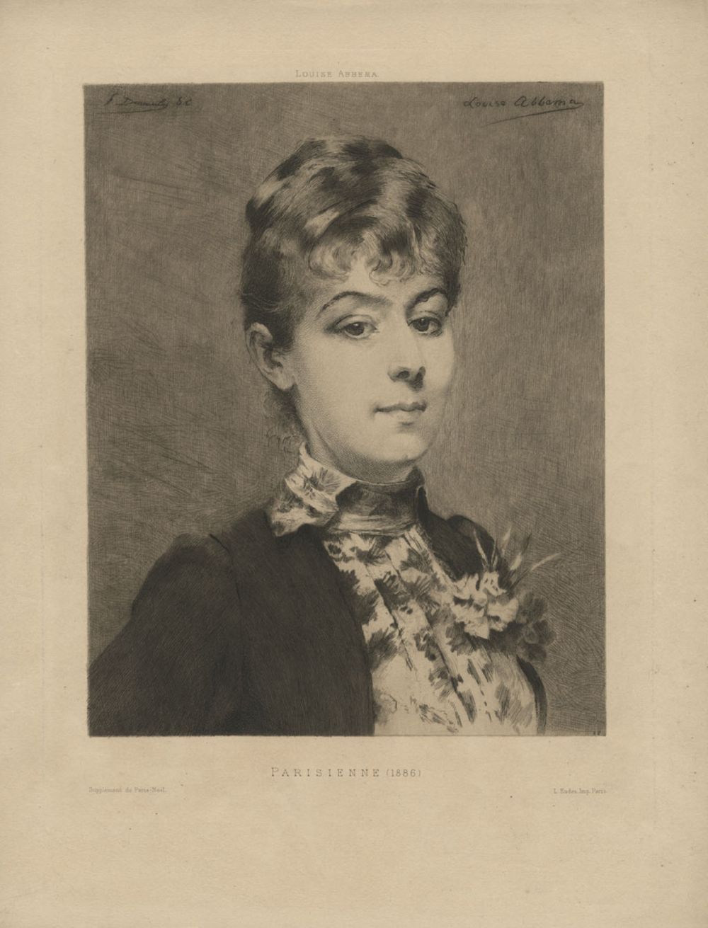 Description: This etching by F. Desmoulin is based on a painting by Louise Abbéma titled "Parisienne", dated 1886. The date of the print itself is not indicated.