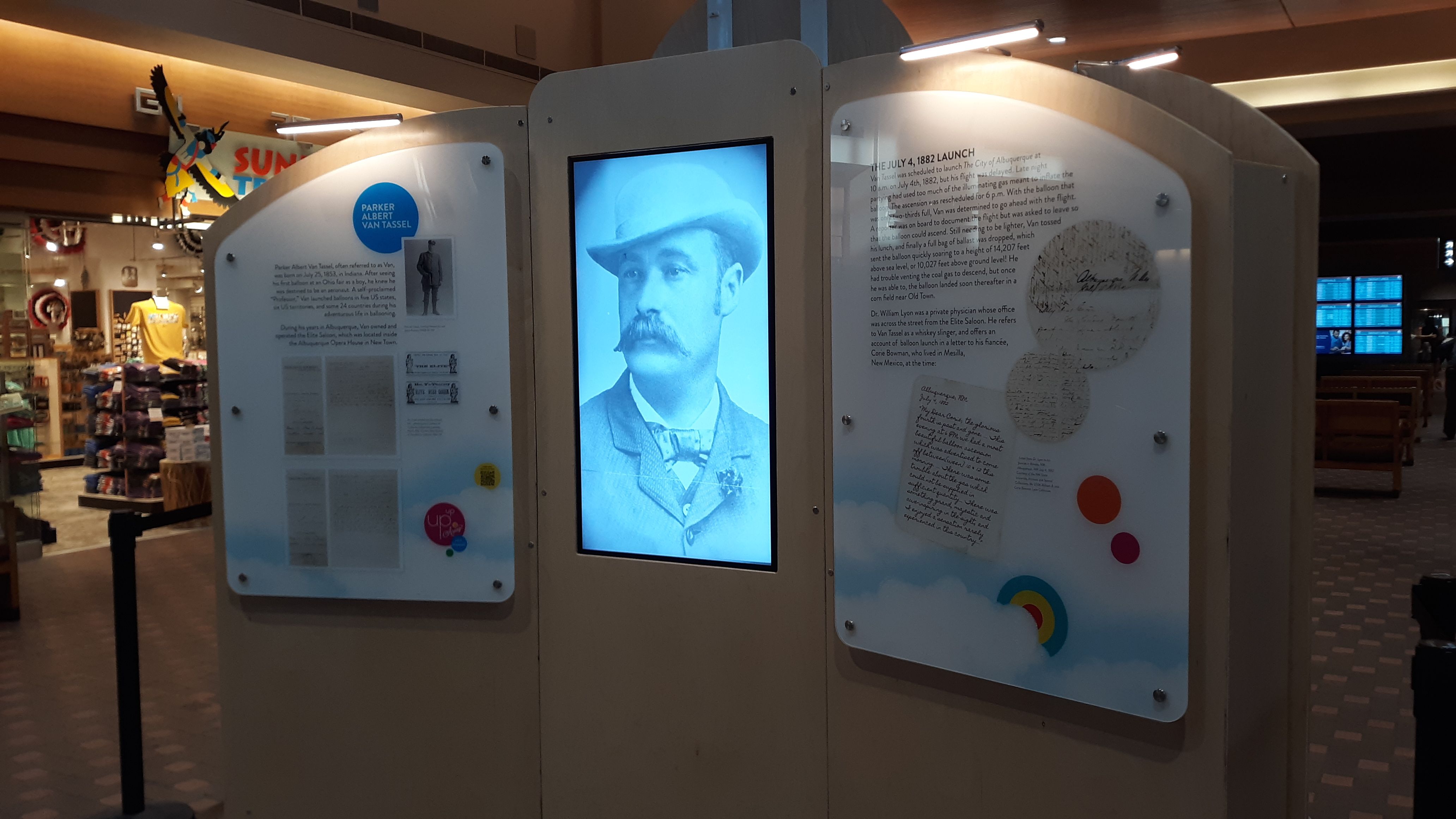 Description: A photo of an exhibit on pioneering American balloonist Park Van Tassel at the Albuquerque Sunport in 2021