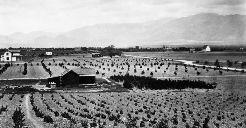 Description: View of Pasadena from south Orange Grove Avenue in 1876.
