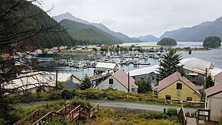 Description: A view of Pelican from above Salmon Way, featuring the marina and First and Second Islands.