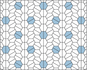 Description: Planar tessellation by a single pentagonal prototile (type 1) with overlays of regular hexagons (each comprised of 2 pentagons).