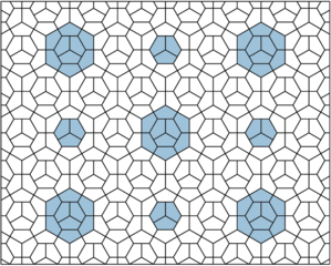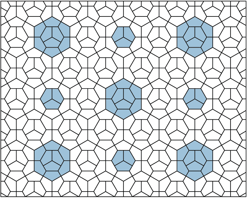 Description: Planar tessellation by a single pentagonal prototile (type 3) with overlays of two sizes of regular hexagons (comprised of 3 and 9 pentagons respectively).