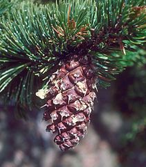 Description: Pinus aristata foliage and cone. Pike and San Isabel National Forests, south-central Colorado.