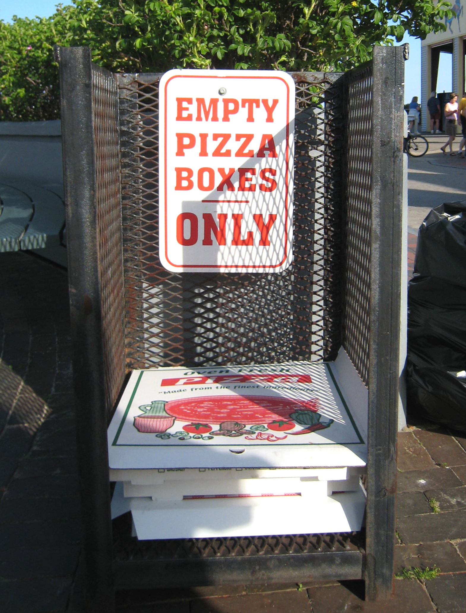 Description: Pizza box collection point, Old Orchard Beach, Maine.