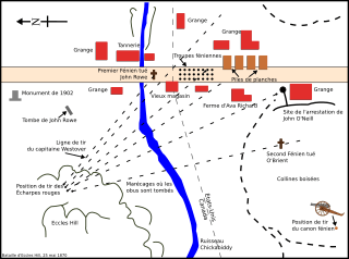 Description: Plan de la bataille d'Eccles Hill du 25 mai 1870. Calqué sur le panneau d'information de la Ville de Frelighsburg, de la Société d'histoire - Musée Missisquoi et de Parcs Canada : « Frelighsburg dans la tourmente des Fenians irlandais entre 1866 et 1870 ». Panneau d'interprétation sur le Lieu historique national du Canada de la Bataille-d'Eccles-Hill. Photographie Le plan inclus une image de File:Cañon s.XIX.svg réalisée par Anenja.