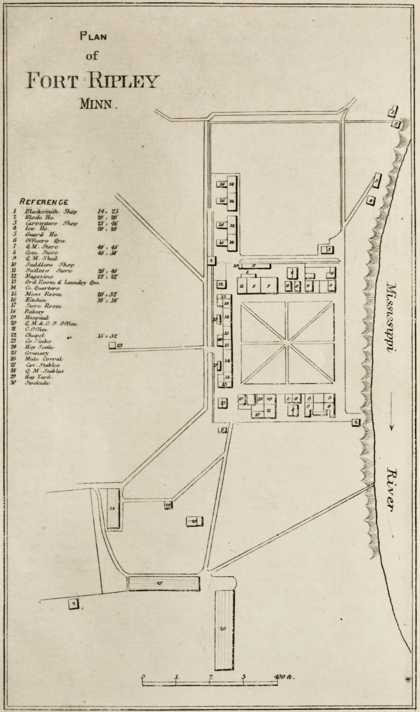 Description: Map showing plan of Fort Ripley, Minnesota. Established as Fort Gaines, 1848, and renamed Fort Ripley November 4, 1850. Surveyed June 5, 1874. Buildings for two companies