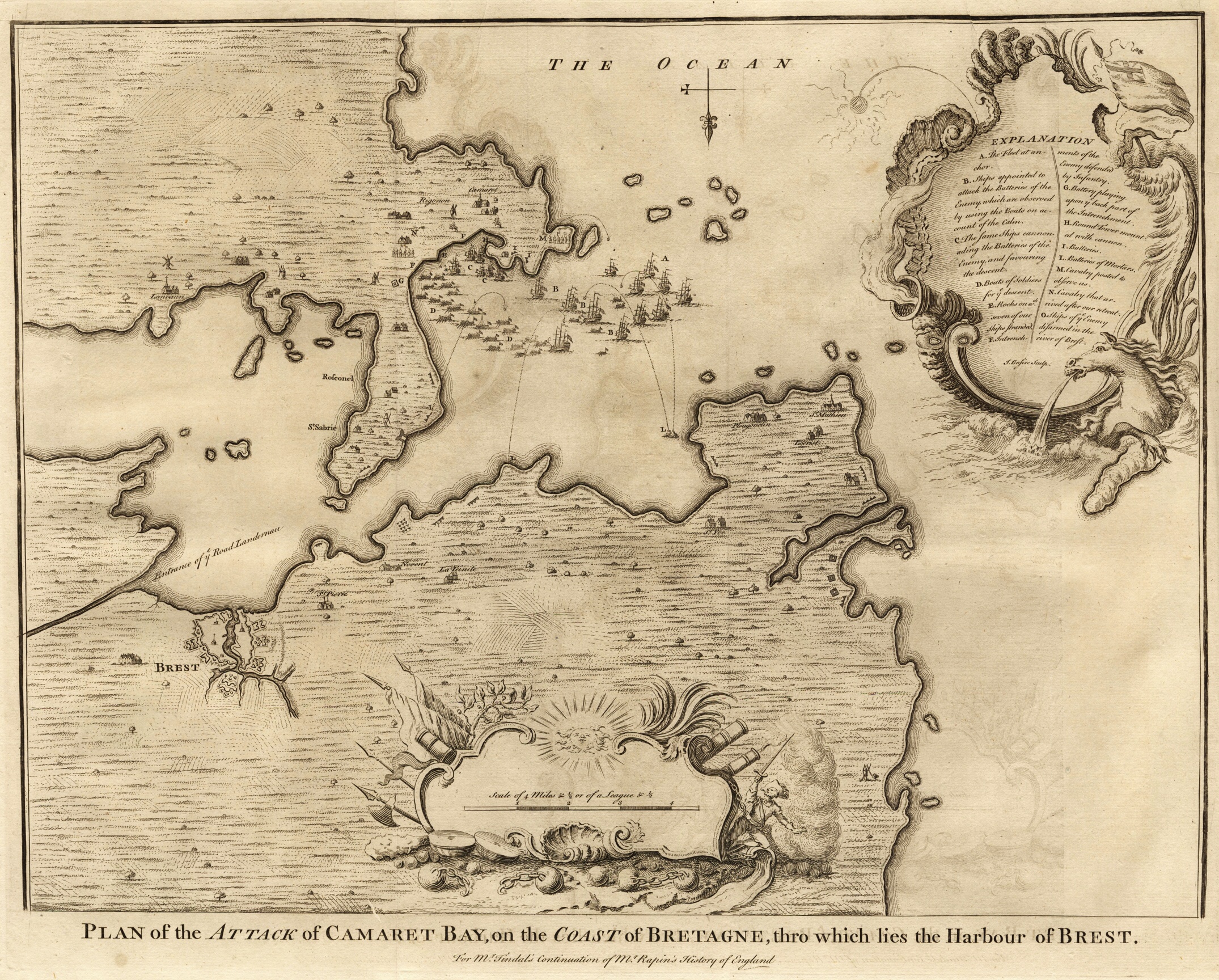Description: Plan of the Attack of Camaret Bay, on the Coast of Bretagne, thro which lies the Harbour of Brest. For Mr. Tindal's continuation of Mr. Rapin's History of England Explanation: A: The fleet at anchor. B: Ships appointed to attack the Batteries of the Enemy which are observed by using the Boats of the Cahn. C: The same ships cannonading the Batteries of the Enemy and favouring the descent. D: Boats of soldiers for the descent. E: Rocks on which seven of our ships stranded. F: Intrenchments of the Enemy defended by Infantry. G: Battery playing upon the back part of the Intrenchment. H: Round Tower mounted with cannon. I: Batteries. L: Batteries of Mortars. M: Cavalry posted to observe us. N: Cavalry that arrived after our retreat O: Ships of the Enemy disarmed in the river of Brest