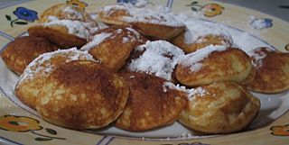 Description: Poffertjes, Dutch cuisine, dessert, very small pancakes