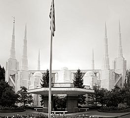 Description: The Portland Oregon Temple, the 42nd operating temple of The Church of Jesus Christ of Latter-day Saints, located near the intersection of Highway 217 and I-5 in Lake Oswego, Oregon.