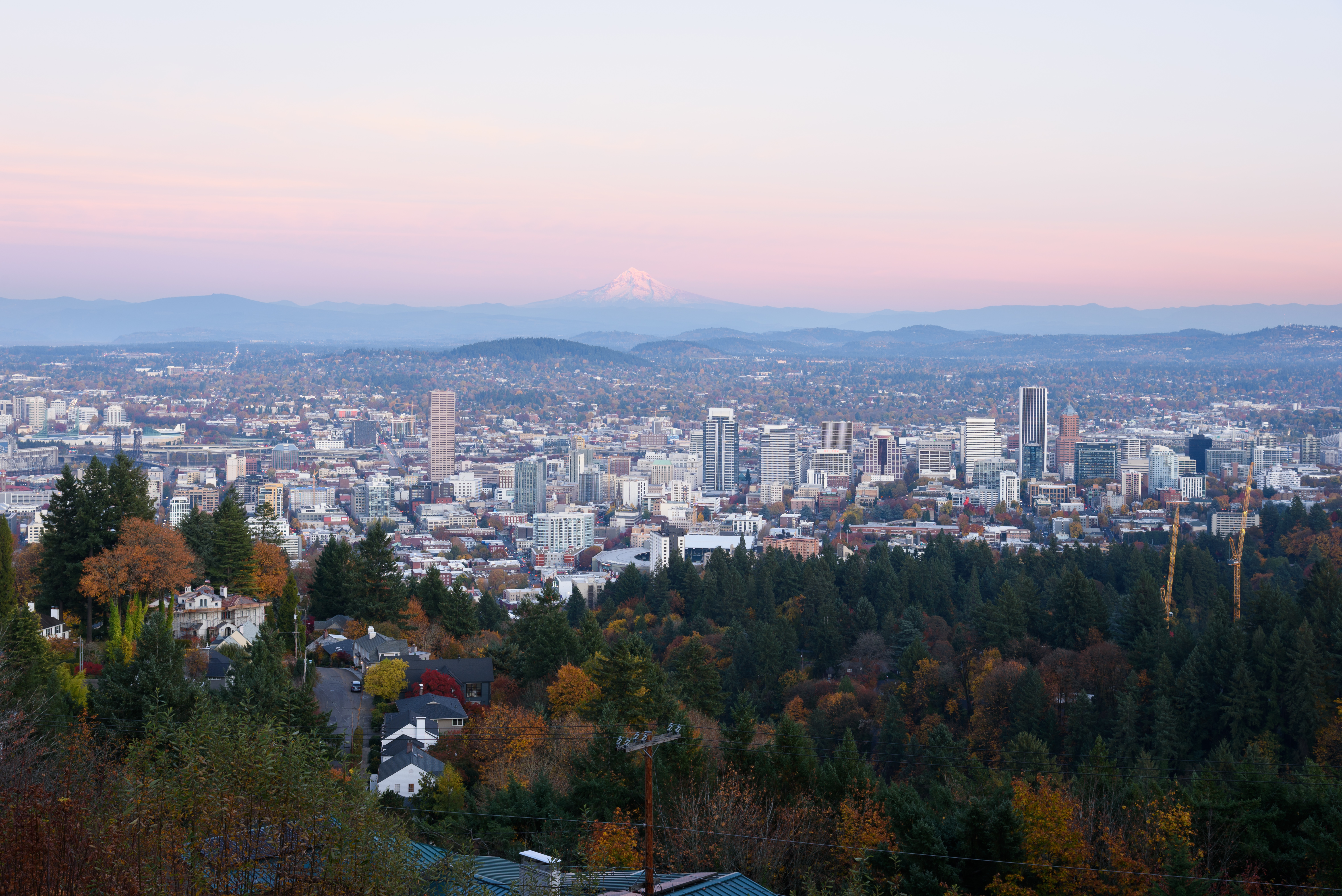 Description: Skyline of Portland, Oregon, from Pittock Mansion viewpoint at dusk.