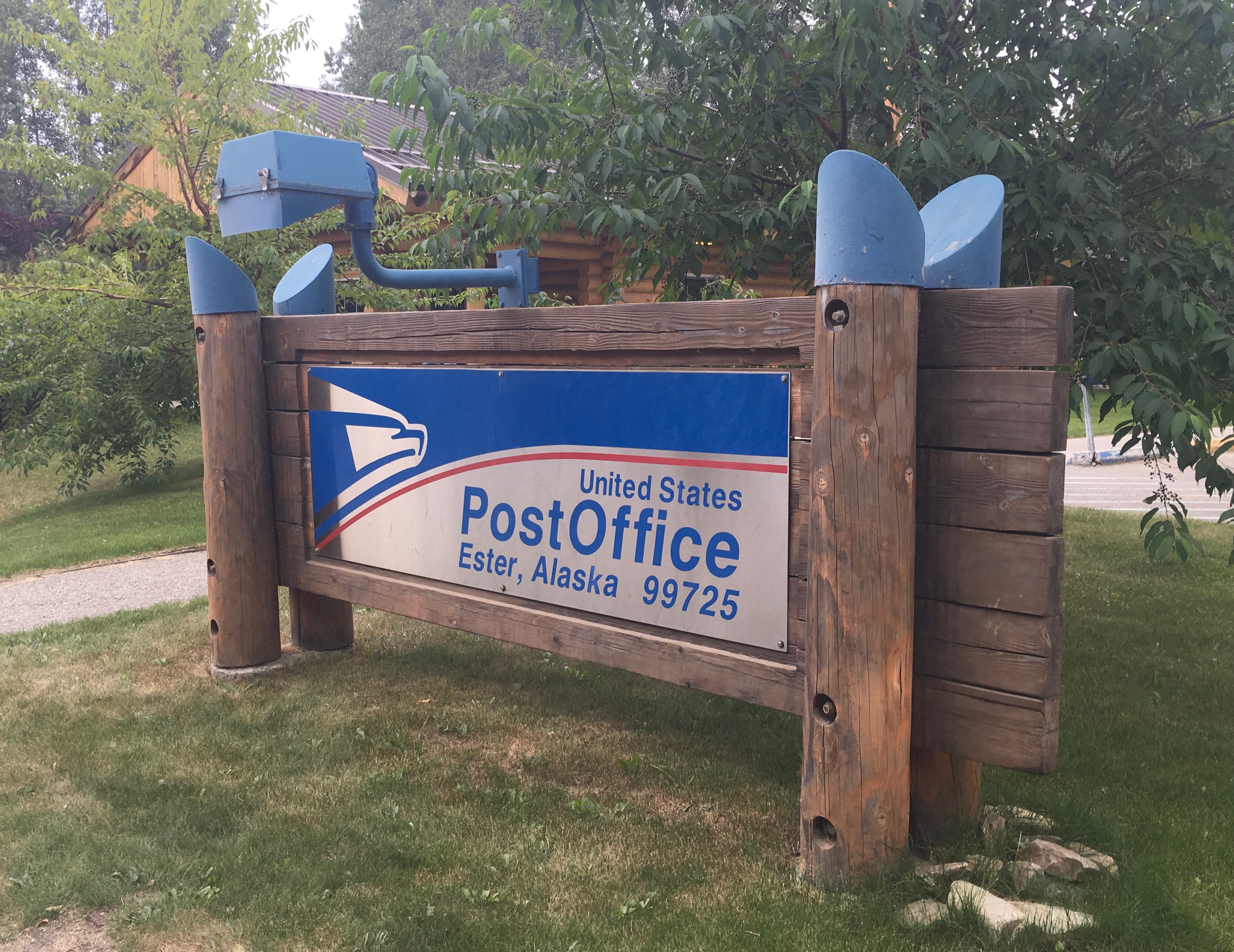 Description: Sign for the US post office in Ester, Alaska zip code 99725