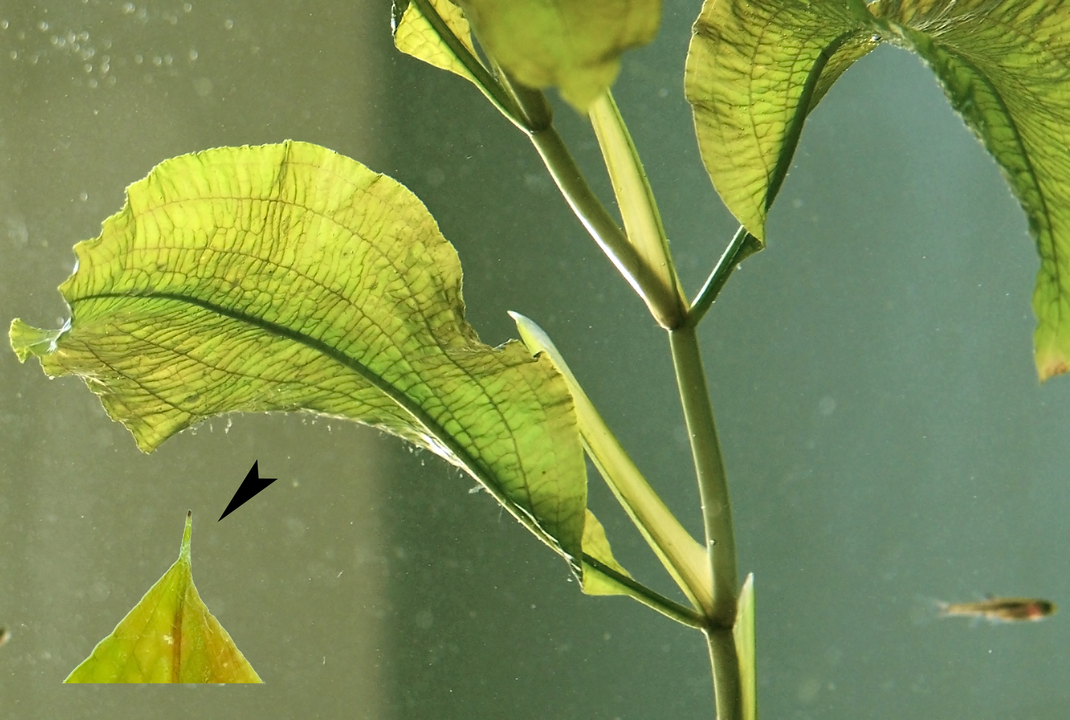 Description: Potamogéton lucens L. Common En-name: Shining Pondweed Common German-name: Glänzendes Laichkraut, spiegelndes Samkrautgewächs. Description in German: Alle Blätter untergetaucht, glänzend, obere länger-, untere kürzer-gestielt, mit feiner Quernervatur. Blattrand sehr feingesägt-rauh (Lupen-Finger-Test!). Blattgrund verschmälert, dicker Mittelnerv endet in einem Horn (Lupe!) bzw. Schnabel (mehrere mm). Blatthäutchen mit bloßem Auge zu erkennen. Habitat: Tiefe-stehende oder mäßig-fließende Gewässer.