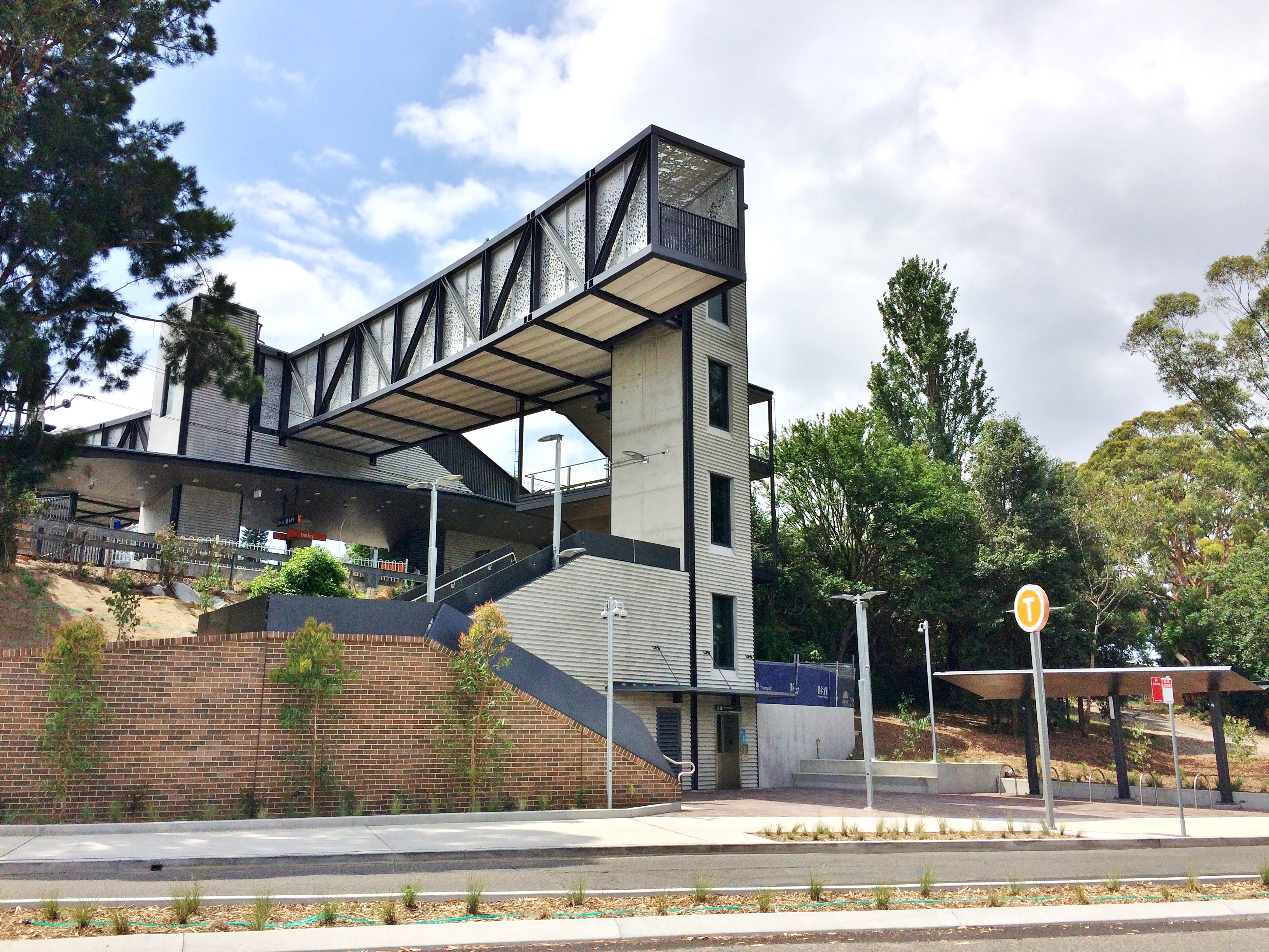 Description: Original caption: "(Photo 1 in a series of 2) Two views, from different angles, of the Mulga Road entrance of the redeveloped Oatley railway station. Taken on 3 December 2016. Upgrade works on the station commenced in May 2015, and were completed in December 2016, allowing accessible entrance through elevators, and entry to the station from both Mulga Road and Oatley parade, via a new footpath marked by a modern architectural design. Oatley railway station is the last station on the South Coast railway line before the Georges river crossing, and is serviced by Sydney Trains' T4 Eastern Suburbs and Illawarra Line service. This photo was contrast and brightness edited from its original file."