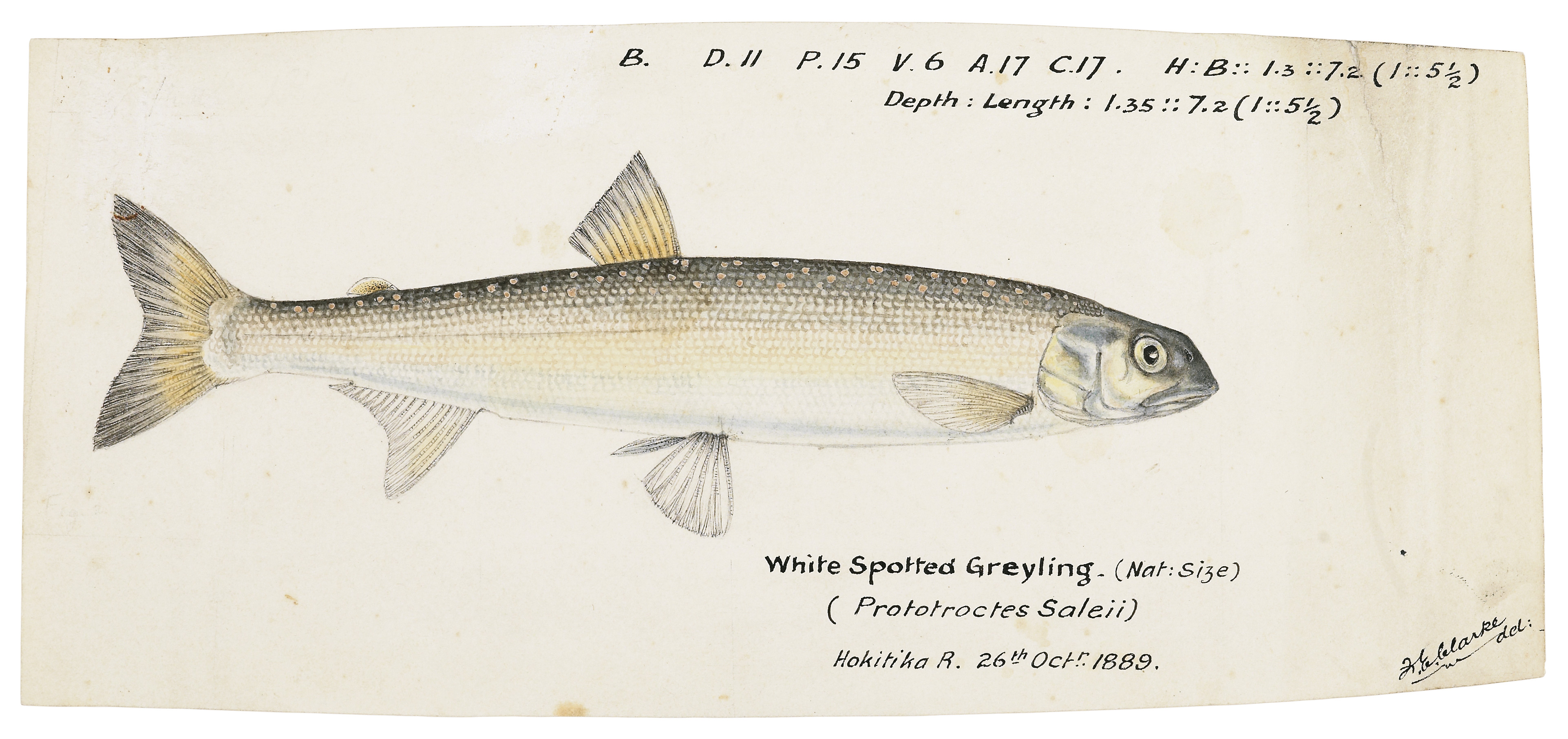 Description: New Zealand’s only extinct freshwater fish is the grayling (Prototroctes oxyrhynchus). This specimen was illustrated from a catch from the Hokitika River in 1889.