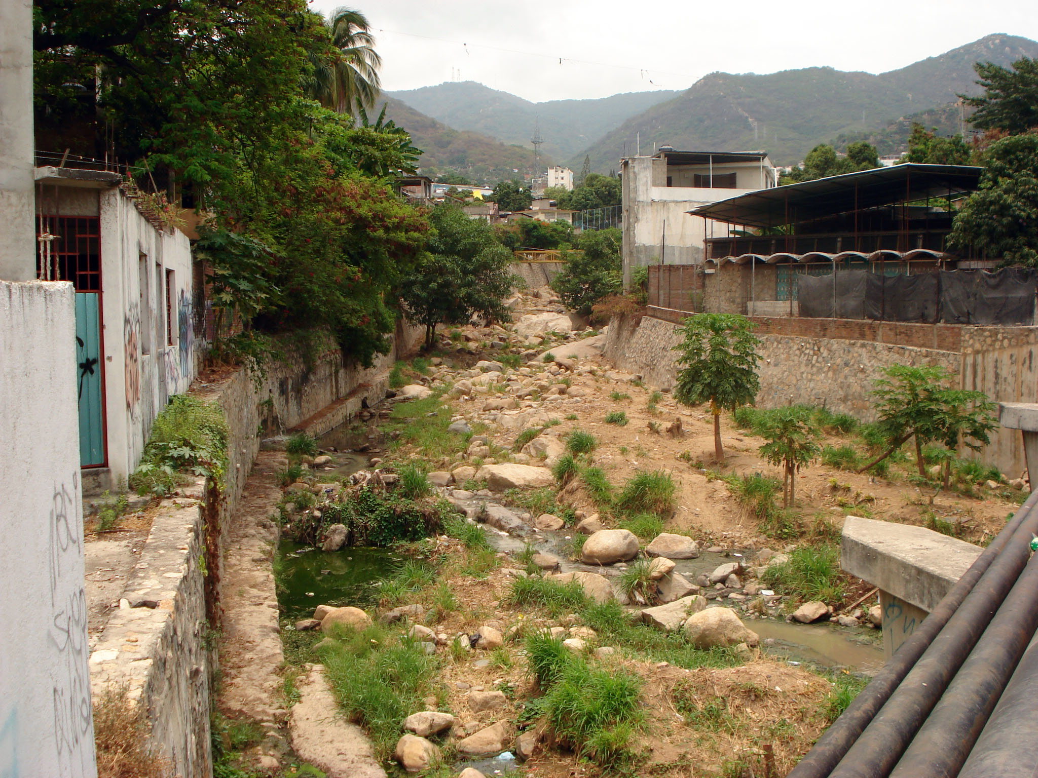 Description: Cauce del río del Camarón visto desde el puente que lo cruza en la Avenida Constituyentes, ubicada en la parte alta de la ciudad y puerto de Acapulco, Guerrero, México. AL fondo, el cerro del Veladero donde tiene origen esta corriente hídrica.
