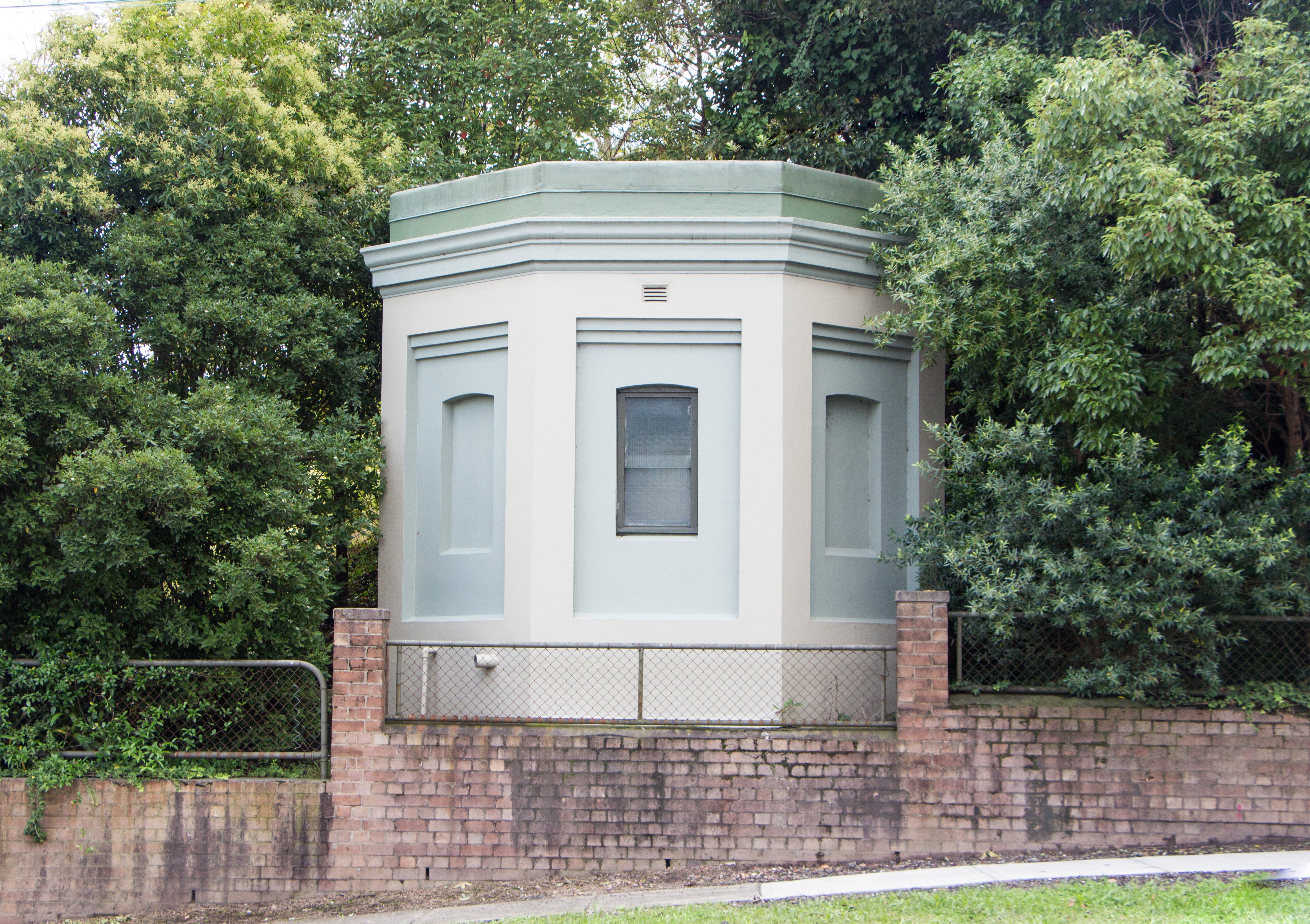 Description: Unusual octagonal valve house located adjacent to Telegraph Road, for Pymble Reservoir No. 1 in Sydney, Australia. The reservoir is listed on the New South Wales State Heritage Register.