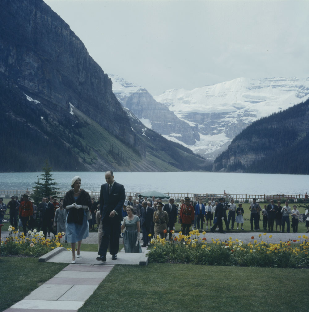 Title: Queen Elizabeth II accompanied by the manager of the Chateau Lake Louise, approaching the entrance to the Chateau. Lake Louise and Victoria Glacier form the backgroundlabel QS:Len,"Queen Elizabeth II accompanied by the manager of the Chateau Lake Louise, approaching the entrance to the Chateau. Lake Louise and Victoria Glacier form the background" label QS:Lfr,"La reine Élizabeth est accompagnée par le gérant du Château du Lac Louise , près de l'entrée du château. À l'arrière, le Lac Louise et le glacier Victoria"