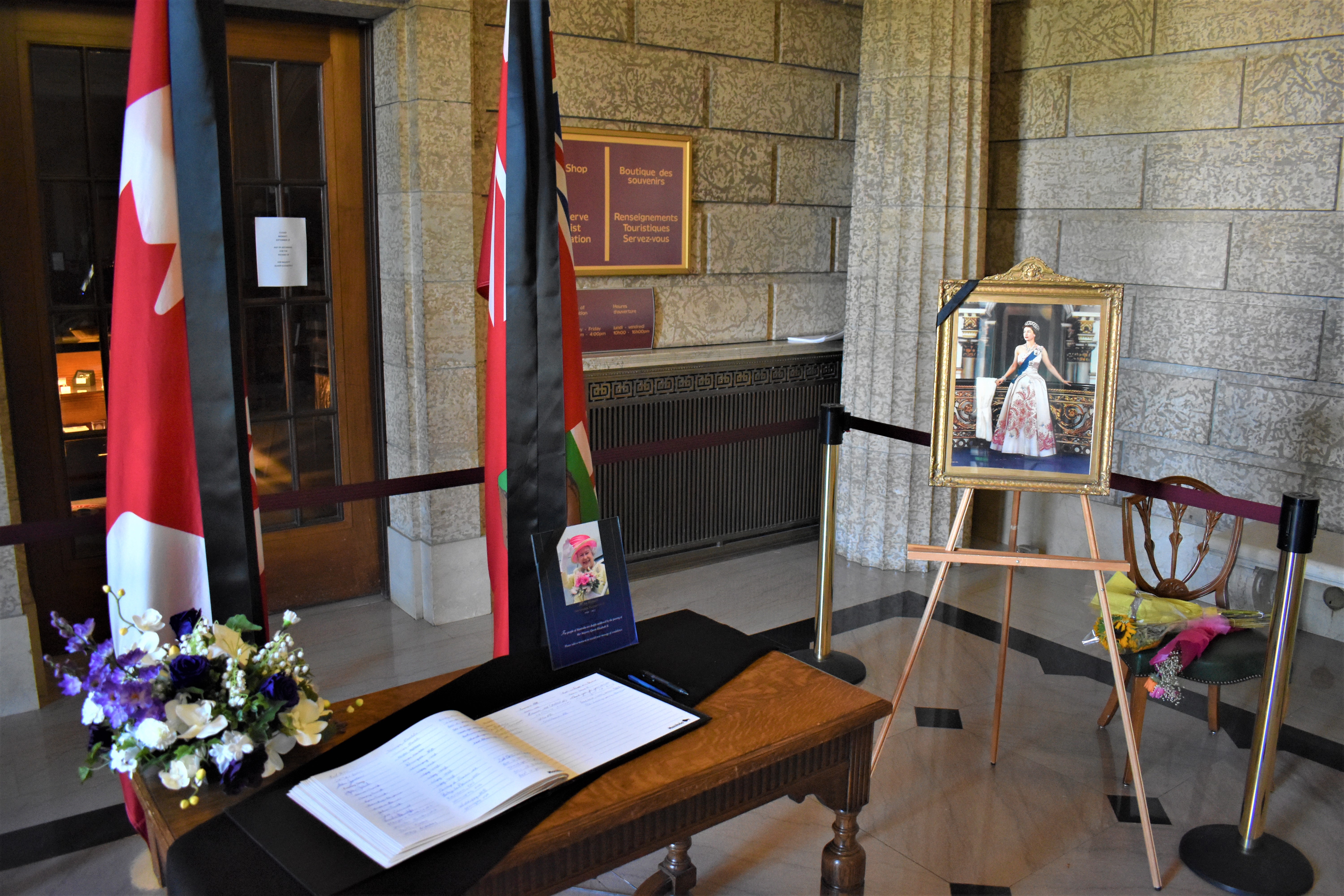 Description: The memorial book for Queen Elizabeth II in the Manitoba Legislative Building following her death in 2022.