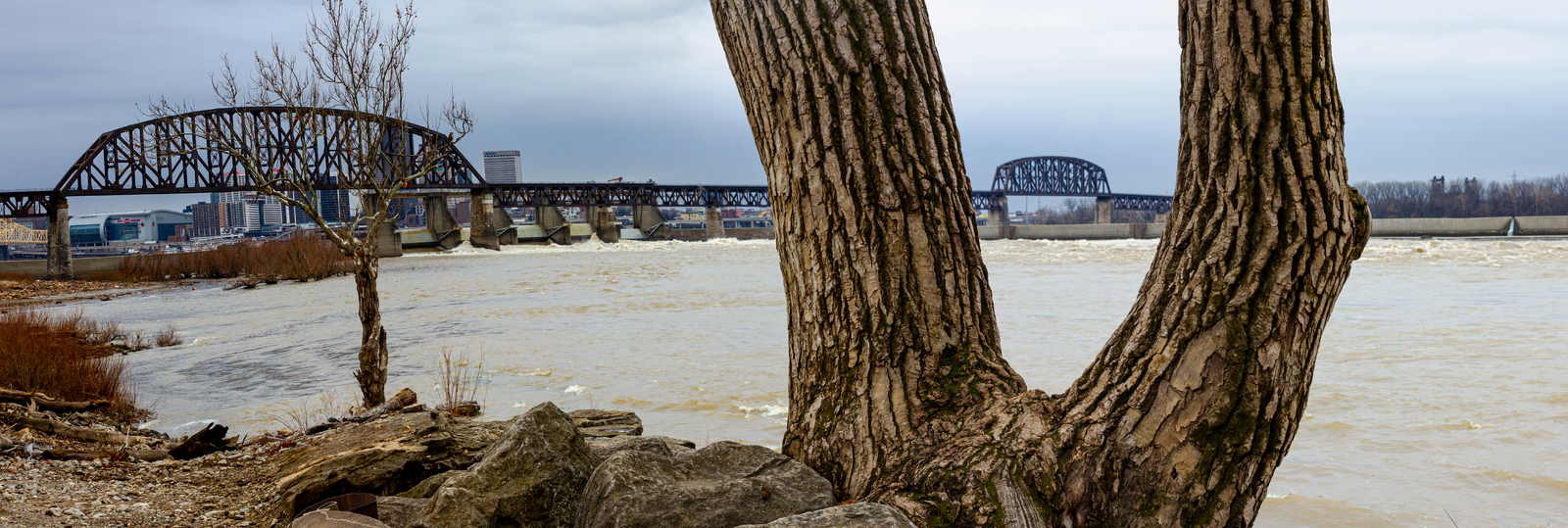 Description: Image of the Ohio River from the Indiana side of the river. Taken in the Falls of the Ohio State Park, looking towards Louisville, Kentucky.