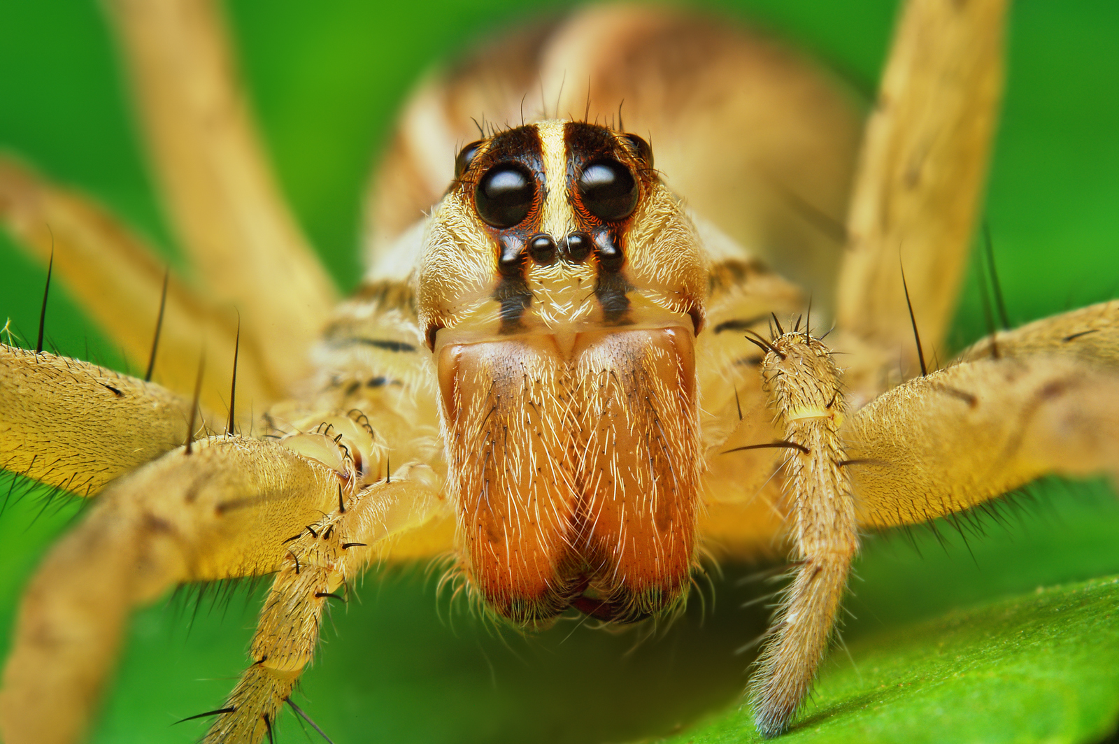 Description: Rescued this female R. rabida from being chopped up in the lawnmower this afternoon and took a few photos before letting her go about her way safely. She was FAST. Despite missing a leg, she made several (almost successful) escape attempts. On the deck, she cleared a good 10 feet in just a few seconds while trying to get away! This species can get quite a bit bigger too - I have seen adult females (I believe this one to be a sub-adult) that would easily cover my entire palm with their legs stretched out! The photo above is a full frame focus stack of 3 photos taken at f/16 with my vintage 1960's thread mount M42 Asahi Pentax "Super Takumar" f/1.4 50mm prime lens reversed to a few extension tubes.