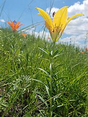 Description: This rare-form yellow lily was one of two of this color amongst the hundreds of typical orange/red wood lilies at the Mayer WPA in Logan County, North Dakota. The lilies flowered like never seen before after a prescribed burn six weeks prior. Photo Credit: Krista Lundgren/USFWS