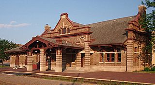 Description: Red Wing Amtrak station (formerly the Chicago, Milwaukee, and St. Paul Passenger Depot), Red Wing Mall Historic District, Red Wing, Minnesota, USA. Viewed from the northwest near sundown. This is an image of a place or building that is listed on the National Register of Historic Places in the United States of America. Its reference number is 80002063.
