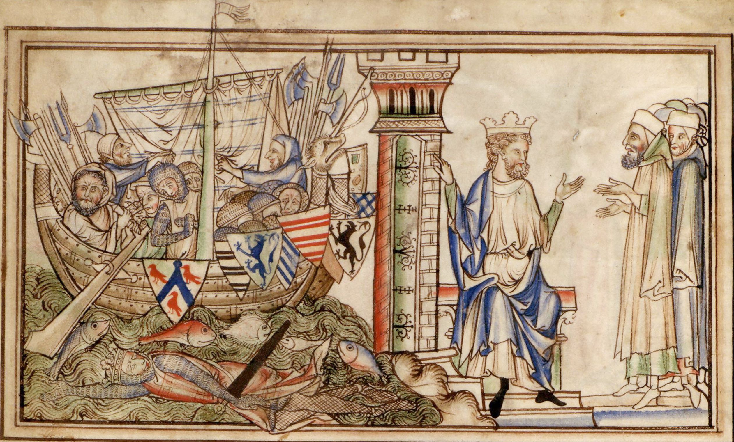 Description: The Return of Earl Godwine and his sons to the court of Edward the Confessor, from a 13th-century MS, Cambridge University MS EE.3.59.