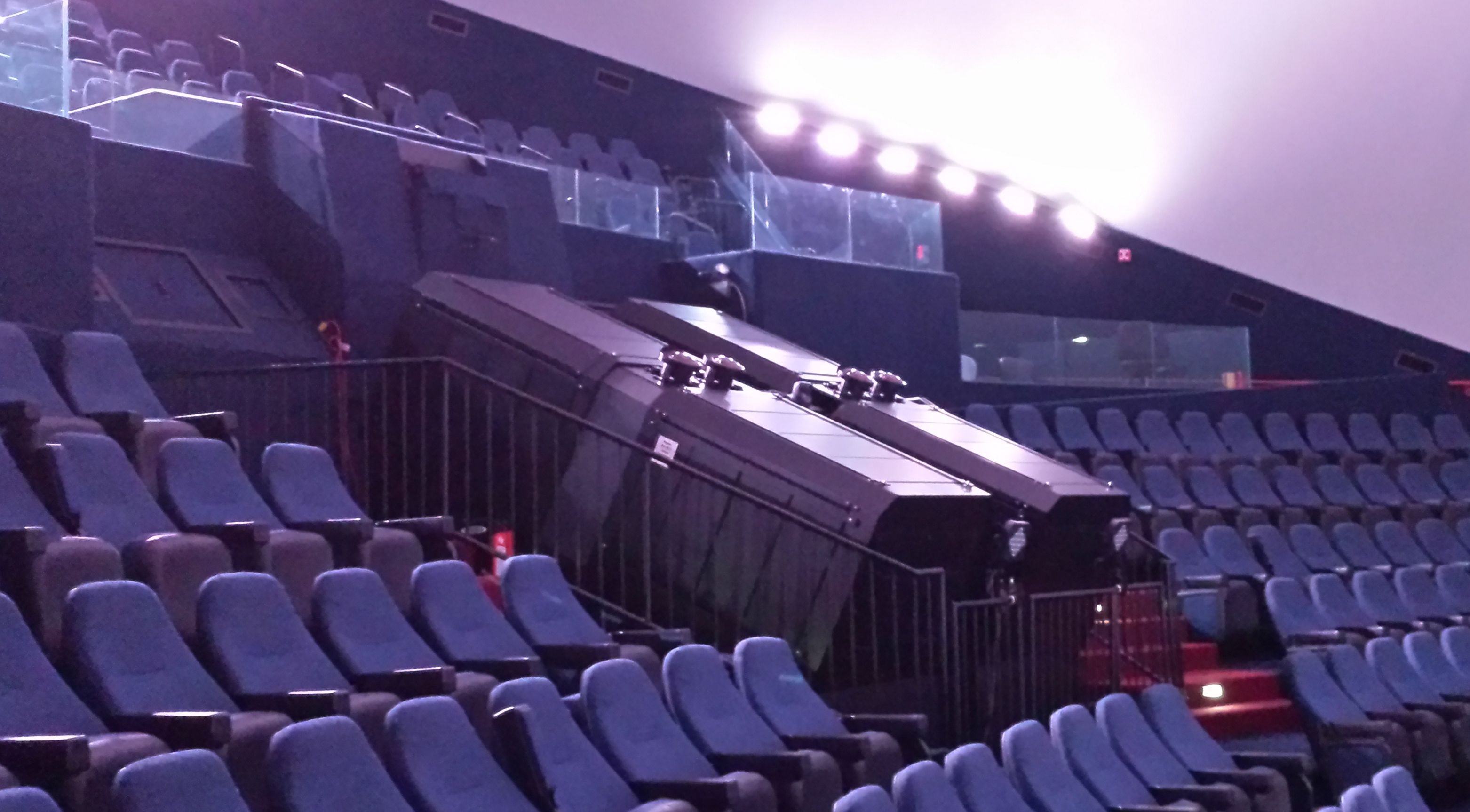 Description: This is a pair of Global Immersion GSX dual 4K projectors, installed in the Reuben H. Fleet Science Center's dome theater in 2012. For projecting IMAX Dome films, the projector's fisheye lens emerges from a door in the structure above the digital projectors.