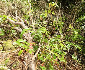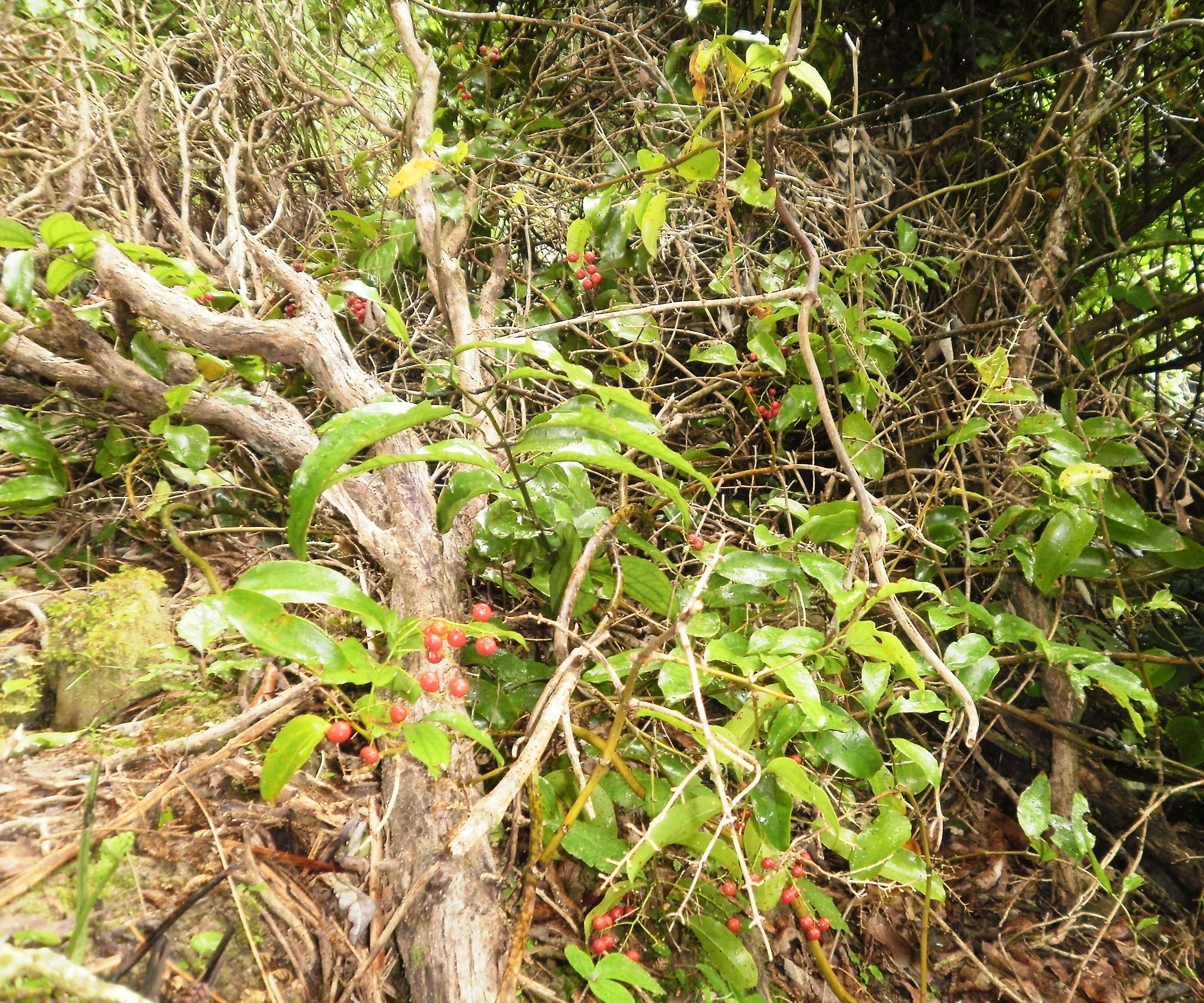 Description: Rhipogonum scandens, supplejack, kareao, with red berries pictured in a Upper Hutt beech forest, New Zealand.