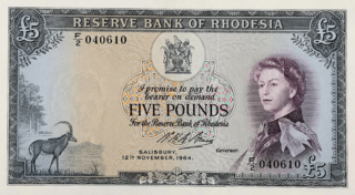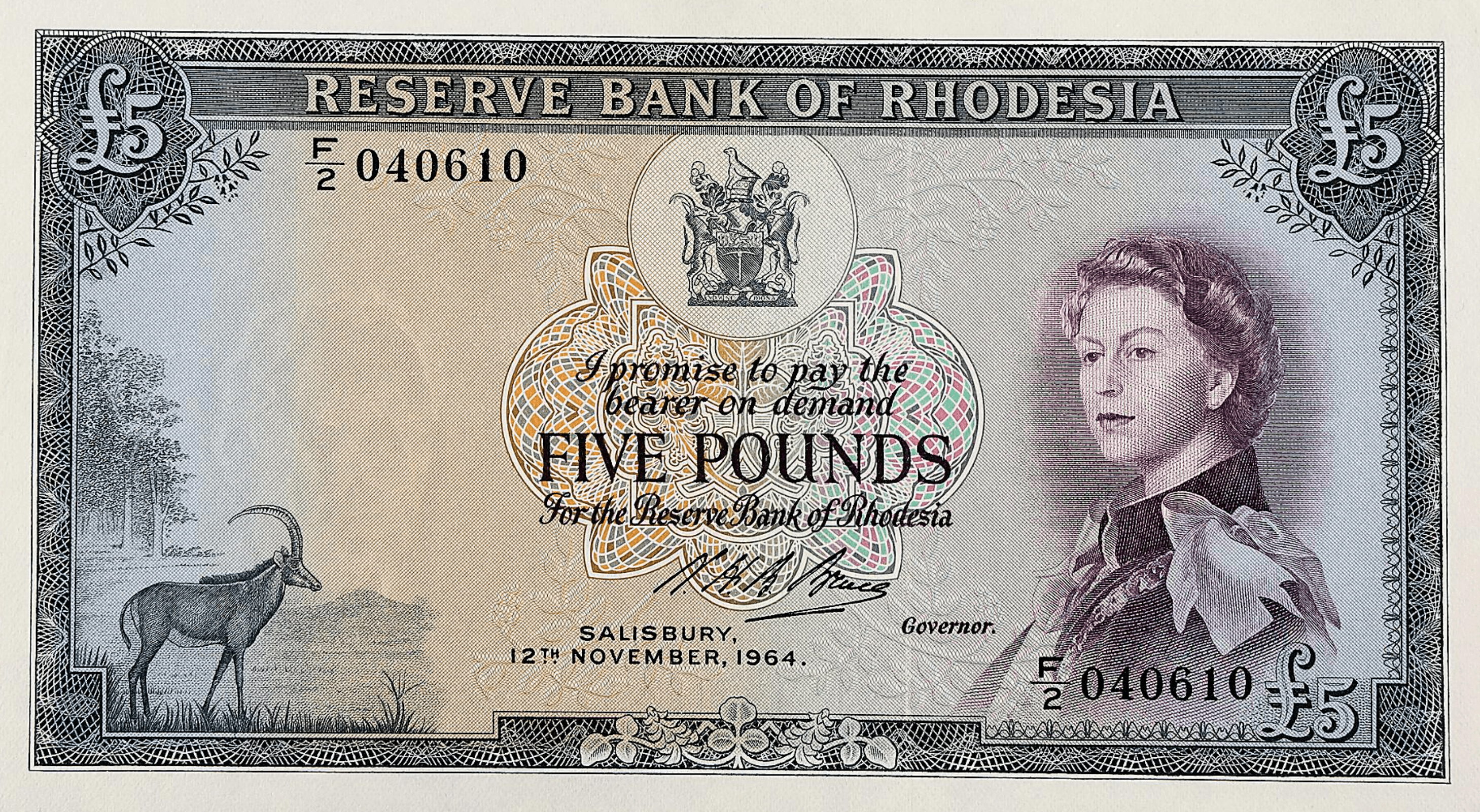 Description: This is an image of the front of the paper Rhodesian £5 note, printed in 1964.