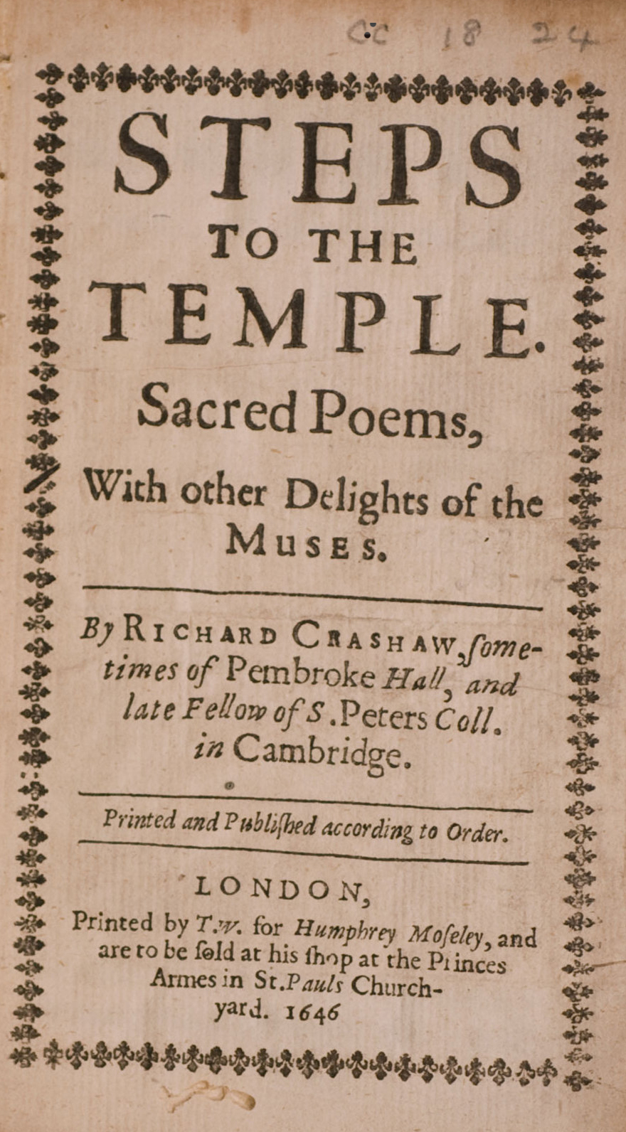 Description: Cover of Richard Crashaw's poetry collection Steps to the Temple. Sacred Poems, With other Delights of the Muses (London: Printed by T. W. for Humphrey Moseley, 1646). Image located at: http://www.english.cam.ac.uk/cambridgeauthors/herbert-influence Other information cropped from the original image on http://www.english.cam.ac.uk/cambridgeauthors/herbert-influence in order to render a two-dimensional work.