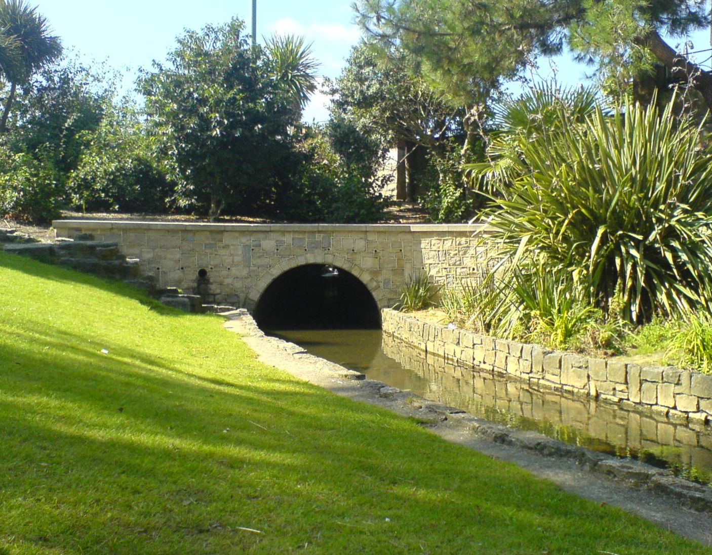 Description: The en:River Bourne, Dorset as it flows through en:Bournemouth, England.