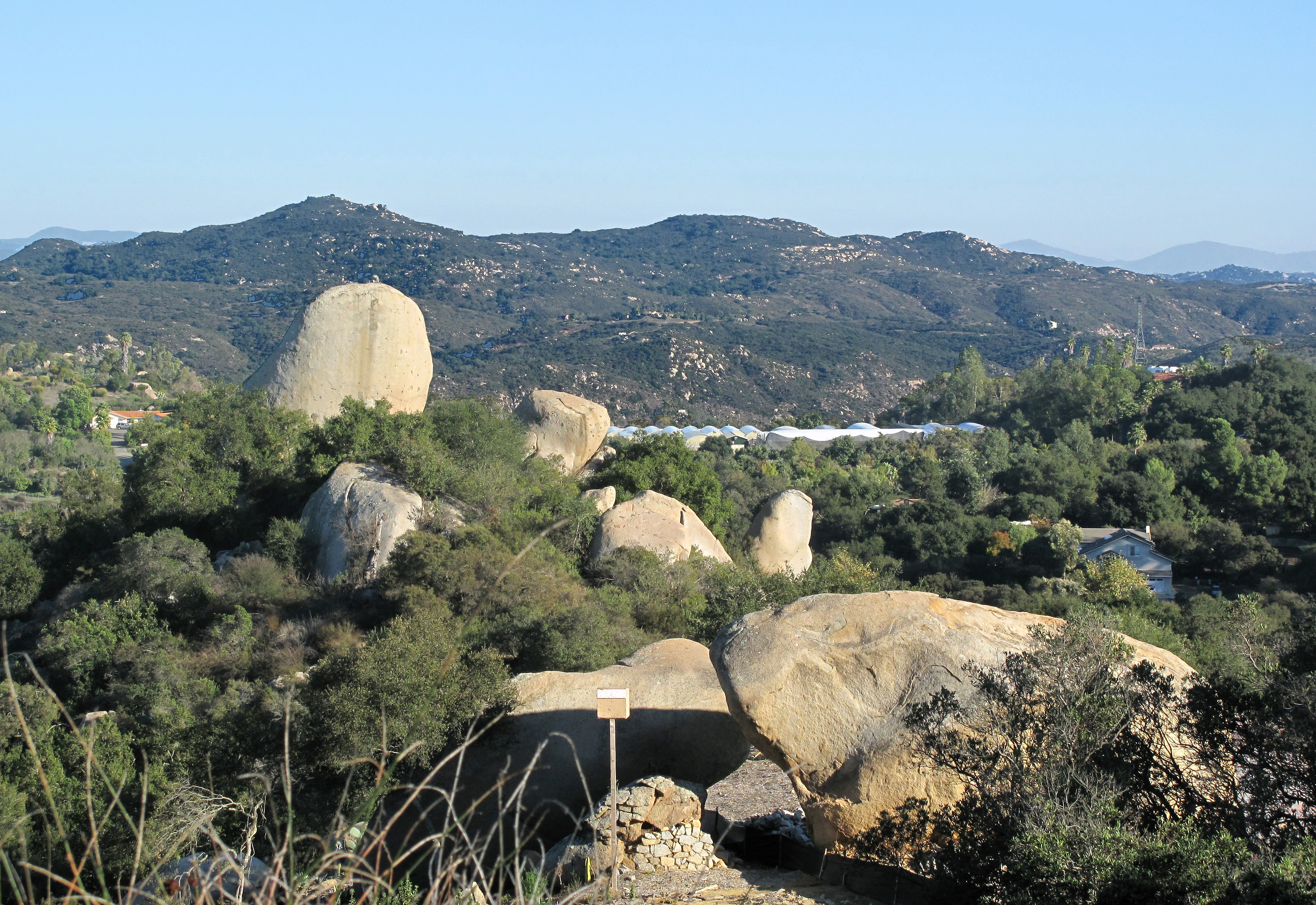 Description: Rock formation, Hidden Meadows, San Diego County, California. Boulders like this are common in the area of several square miles. Houses and roads must be built around them, although many were blasted with dynamite during the rapid expansion of the country club in the 1960s. The large boulder in the center is locally known as Devil's Chair.