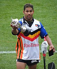 Description: Rod Jensen offers the cup to supporters. RLWC 2008 Aboriginal dreamtime team versus New Zealand Maori.