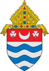 Description: This is a representation of the coat of arms of the Roman Catholic Archdiocese of Newark. Blazon: Barry wavy of six Argent and Azure on a chief Gules between two shamrock leaves slipped a crescent Argent. The following Commons images were used to create this image: File:Roman Catholic Diocese of Erie.svg by Niagara (talk · contribs) (mitre) File:Old French Escutcheon.svg by Masur (talk · contribs) File:Shamrock of Ireland (Heraldry).svg by Sodacan (talk · contribs) File:Croissant Héraldique.svg by Odejea (talk · contribs)