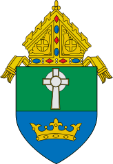 Description: This is a representation of the coat of arms of the Roman Catholic Diocese of Charlotte. Blazon: Vert and Azure in chief a Celtic cross Argent and in base an ancient crown Or. The following Commons images were used to create this image: File:Roman Catholic Diocese of Erie.svg by Niagara (talk · contribs) (mitre) File:Old French Escutcheon.svg by Masur (talk · contribs) File:Coat of arms of the Lordship of Ireland.svg by NsMn (talk · contribs) File:Ccross.svg by AnonMoos (talk · contribs) (design by Petr Vodicka)