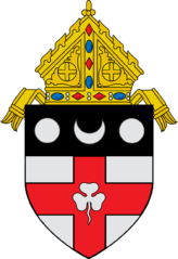 Description: This is a representation of the coat of arms of the Roman Catholic Diocese of Harrisburg. Argent on a cross Gules a shamrock of the field on a chief Sable a crescent Argent between two plates. The following Commons images were used to create this image: File:Roman Catholic Diocese of Erie.svg by Niagara (talk · contribs) (mitre) File:Old French Escutcheon.svg by Masur (talk · contribs) File:Croissant Héraldique.svg by Odejea (talk · contribs) File:Shamrock of Ireland (Heraldry).svg by Sodacan (talk · contribs)