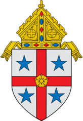 Description: This is a representation of the coat of arms of the Roman Catholic Diocese of Savannah. Blazon: Argent on a cross Gules between four mullets Azure a rose Or. The following Commons images were used to create this image: File:Roman Catholic Diocese of Erie.svg by Niagara (talk · contribs) (mitre) File:Old French Escutcheon.svg by Masur (talk · contribs) File:Blason ville fr Pacy-sur-Eure (Eure).svg by Spedona (talk · contribs)