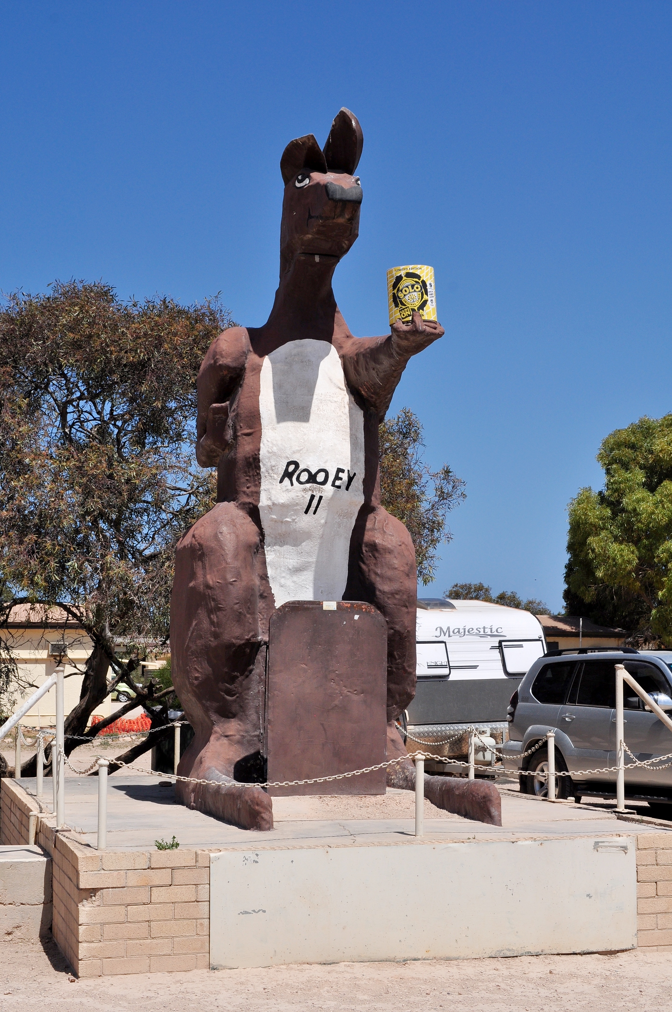 Description: The big kangaroo in Border Village, South Australia, titled "Rooey II". People can stand behind the metal plate in front of the kangaroo so that they look like they are in the pouch when photographed.