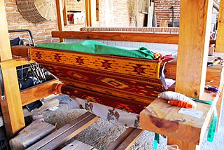 Description: Large rug in progress at a family shop in Teotitlan del Valle, Oaxaca, Mexico
