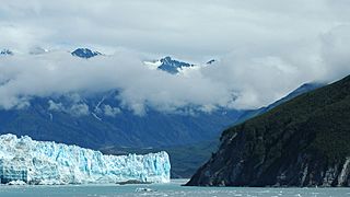 Description: This picture shows the southeast edge of the Hubbard Glacier, beyond the gap is the Russell Fiord. This picture is looking to east direction from Disenchantment Bay, Alaska. The gap was periodically blocked by the glacier and the Russell Fiord turned into a lake collecting freshwater run-off from the glacier.