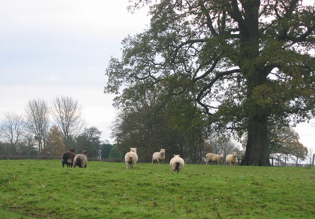 Description: Ryeland Sheep. Field: The Orchard, Court farm. Cider/Perry Orchard grubbed up in the early 1960s. The pears survived slightly longer but have now gone as well. One hedge realigned. Looking East. Both black and white Ryeland sheep, the local breed.