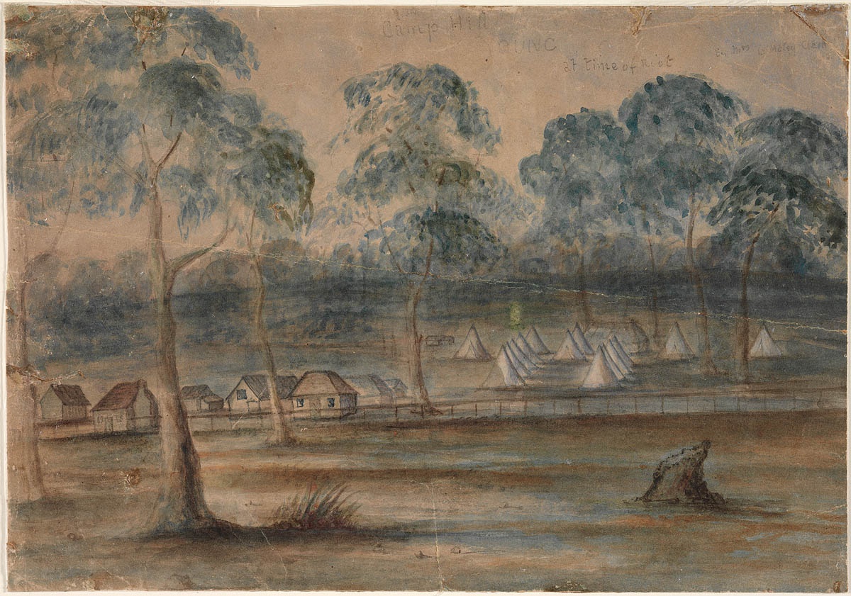 Description: Camp Hill (Lambing Flats) at time of Riot, Young , 1860-61, incribed 'by Mrs C. Moley Clark', from watercolour drawing, State Library of New South Wales, DG SV1B/3